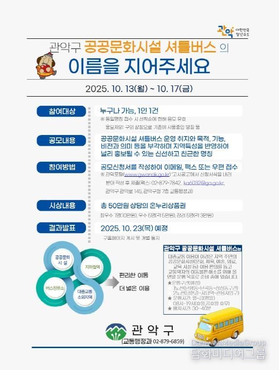 아울러 구는 오는 17일까지 공공문화시설 셔틀버스 명칭을 공모한다. 지역 제한없이 누구나 응모할 수 있으며 셔틀버스의 목적과 비전을 담아낸 이름을 지어 담당자 이메일또는 팩스로 제출하면 된다. 당선작은 10월 23일 개별 통지되고, 구청 홈페이지에도 게시될 예정이다.