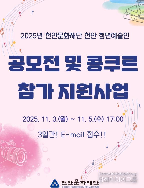 시민행정신문 강갑수 기자 | 천안문화재단은 내달 3~ 5일까지 ‘천안 청년예술인 공모전 및 콩쿠르 참가 지원사업’ 참여자를 모집한다고 15일 밝혔다.