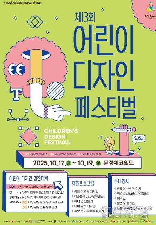 시민행정신문 강갑수 기자 | 경상북도와 문경시가 주최하고 (사)디자인정책연구원이 주관하는 제13회 대한민국 어린이제품 디자인 공모전 ‘어린이 디자인 페스티벌’이 10월 17일부터 19일까지 사흘간 문경에코월드에서 열린다.