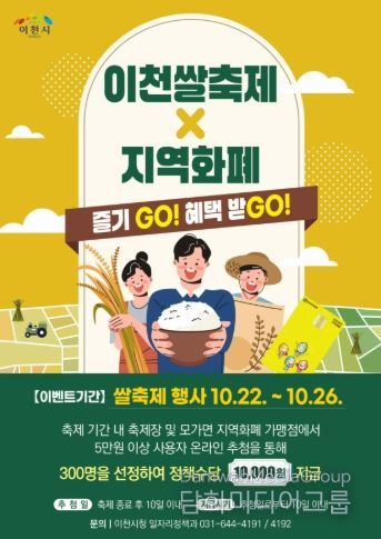 시민행정신문 이세훈 기자 | 이천시는 2025 이천쌀문화축제 기간에 지역화폐 이용을 촉진하고 지역경제를 활성화하기 위해 코나아이(주)의 경기지역화폐 사회공헌 재원을 활용하여 ‘이천쌀축제, 지역화폐로 즐기고(GO), 혜택받고(GO)’ 이벤트를 추진한다고 밝혔다.