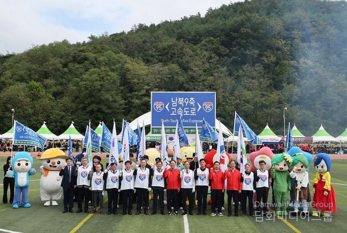행사는 ‘남북9축, 함께 잇다’ 슬로건 아래 강원·경북 10개 시‧군 대표단이 운동장 양 끝에서 동시에 출발, 중앙에 위치한 제막무대에서 하나로 모여 ‘남북9축 고속도로’ 표지판을 공동 제막하는 순으로 진행됐다.