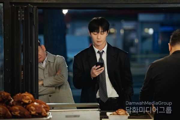 공개된 사진 속에는 일과를 마친 직장인 이경도의 퇴근 현장이 담겨 있다. 살짝 풀린 넥타이가 이경도 캐릭터의 어른미(美)를 더욱 돋보이게 만든다. 퇴근 후에도 휴대폰을 손에서 놓지 않고 계속해서 이슈를 확인하는 이경도의 눈빛에는 일상의 권태로움이 서려 있다.
