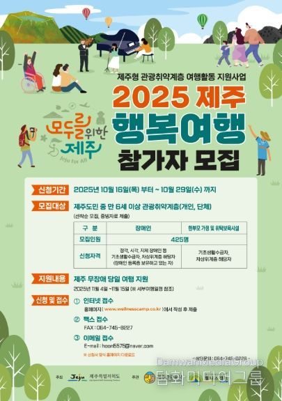 모집은 선착순으로 진행되며, 제주도민으로서 기초 생활 수급자, 차상위계층, 장애인 등 425명이 대상이다. 도내 관련 단체 또는 개인 단위로 신청이 가능하며, 팩스, 이메일을 통해 접수할 수 있다.