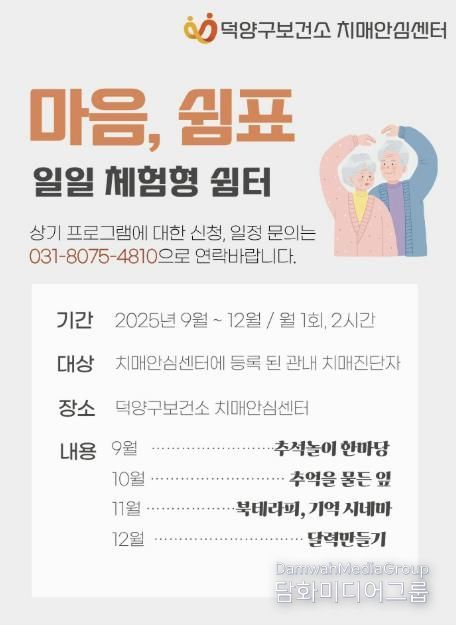 시민행정신문 기자 | 고양특례시 덕양구보건소 치매안심센터는 정규 쉼터 프로그램 참여가 어려운 관내 치매 어르신을 대상으로, 일일 체험형 쉼터 프로그램 ‘마음, 쉼표’를 12월까지 운영한다고 밝혔다.