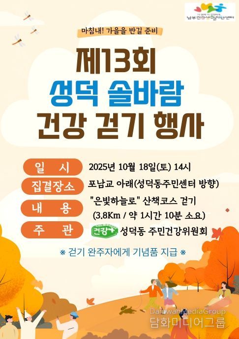 이경희 건강증진과장은 “지역주민과 성덕동 주민건강위원회가 함께 준비한 이번 행사를 통해 시민들이 걷기의 즐거움을 느끼고 스스로 건강을 지켜가는 계기가 되길 바란다.”고 말했다.