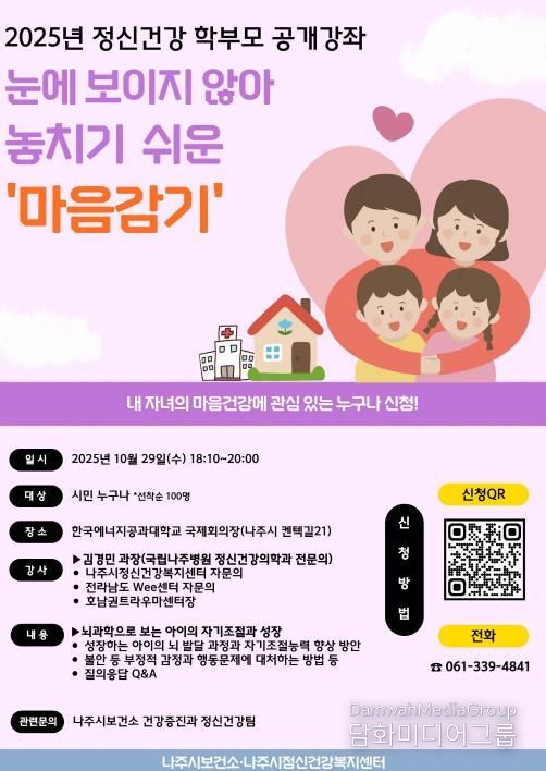 강용곤 나주시 보건소장은 “이번 강좌를 통해 학부모들이 자녀의 정신건강에 대해 더 잘 이해하고 건강한 양육 방법을 알아가는 시간이 되길 바란다”며 “앞으로도 부모와 자녀의 정신건강 증진을 위한 사업을 적극 추진하겠다”고 밝혔다.