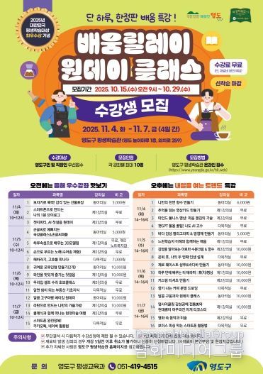 수강신청은 10월 29일까지 영도구 평생학습관 홈페이지를 통해 선착순 접수로 진행된다.