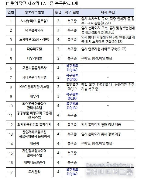다만, 고용노동부의 노동포털 등 12개 시스템이 여전히 중단된 상황으로 임시 대표 누리집(홈페이지) 개통, 기관 대표 이메일 접수 등 대민업무에 불편을 최소화하기 위한 대체 방안을 마련·시행 중이다.