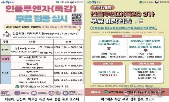 시민행정신문 이존영 기자 | 관악구가 환절기를 맞아 독감 고위험군을 대상으로 무료 3가 독감 예방접종을 실시한다.