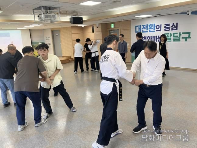 시민행정신문 강갑수 기자 | 수원시 팔달구는 공공청사 내 각종 폭력 및 테러에 대응하기 위해 지난 17일 SOS팔달안전봉사단과 구·동 공직자를 대상으로 구청 대회의실에서 호신술 실습 등 범죄예방 교육을 실시했다.