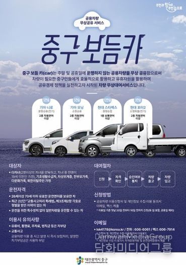 시민행정신문 강갑수 기자 | 대전 중구는 지난 4월 21일부터 대전 최초로 시행한 공용차량 무상대여 서비스 ‘보듬카’가 시민들에게 큰 호응을 얻고 있다고 밝혔다.