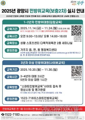 시민행정신문 강갑수 기자 | 광양시는 10월부터 상반기 기본교육을 이수하지 않은 민방위 대원을 대상으로 ‘2025년 민방위 보충 2차 교육’을 실시한다고 밝혔다.