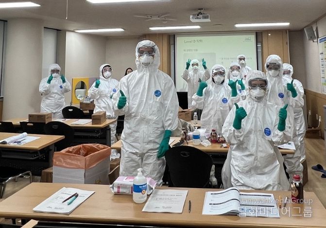 교육 주요 내용은 조류인플루엔자 인체감염증 발생 대비·대응체계, 농장 등에서 조류인플루엔자 발생 시 인체감염 예방조치 요령 등 이론 교육과 개인보호복(Level D) 착·탈의 등 실제 현장 투입을 대비한 실습 위주의 감염병 예방 훈련으로 구성됐다.