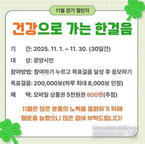 시민행정신문 강갑수 기자 | 광양시는 지역 주민의 건강생활 실천을 돕기 위해 11월 1일부터 30일까지 모바일 걷기 앱 '워크온'에서 ‘건강으로 가는 한걸음 11월 걷기 챌린지’를 운영한다고 밝혔다.