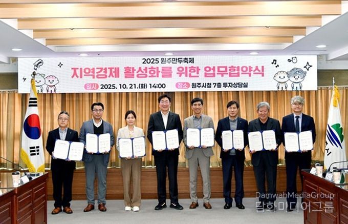 시민행정신문 이세훈 기자 | 원주시는 오는 24일부터 26일까지 열리는 ‘2025 원주만두축제’의 성공적 개최와 지역 상권 활성화를 위해, 21일 시청에서 ‘지역경제 활성화를 위한 업무협약’을 체결했다.