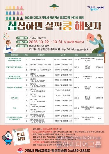 시민행정신문 강갑수 기자 | 거제시는 오는 10월 22일부터 31일까지 ‘심쿵해(심심하면 살짝쿵 해보자)’ 평생학습 프로그램 수강생을 선착순으로 모집한다고 밝혔다.