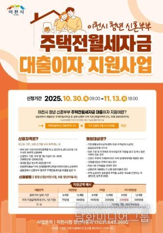 시민행정신문 강갑수 기자 | 이천시는 청년 신혼부부의 주거비 부담을 줄이고 지역 내 안정적인 정착을 돕기 위해 ‘이천시 청년 신혼부부 주택전월세자금 대출이자 지원사업’을 올해도 이어간다고 밝혔다.