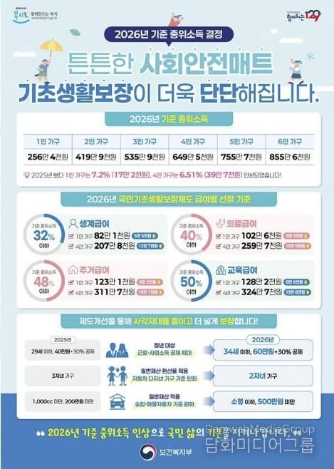 2026년부터는 청년 근로·사업소득 공제 적용 연령은 만 34세 이하로 확대되고, 소득 기본 공제액은 60만 원으로 늘어난다. 이와 함께 차량가액 500만 원 미만의 소형 승합·화물자동차는 일반재산 소득환산율(4.17%)이 적용돼 재산 기준 부담이 완화된다.