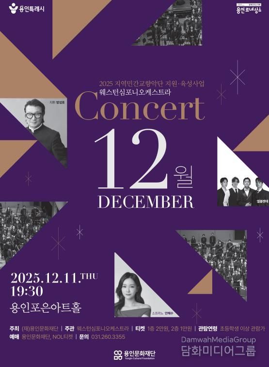 시민행정신문 기자 | 용인문화재단은 오는 12월 11일 오후 7시 30분, 용인포은아트홀에서 웨스턴심포니오케스트라 '콘서트 ‘12월’' 공연을 개최한다.