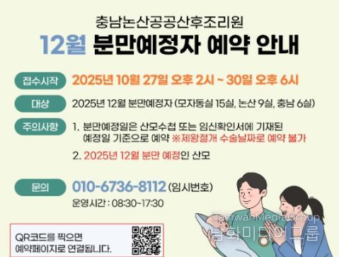 대상은 산모수첩, 임신확인서 예정일 기준 12월 분만 예정자로, 신청은 충남논산공공산후조리원 홈페이지(를 통해 온라인으로 진행된다.