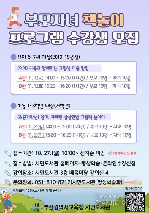 시민행정신문 기자 | 부산광역시립시민도서관은 다음달 1일부터 이틀간 시민도서관 배움마당 강의실에서 학부모와 자녀 80명을 대상으로 ‘하반기 부모자녀 프로그램’을 운영한다.