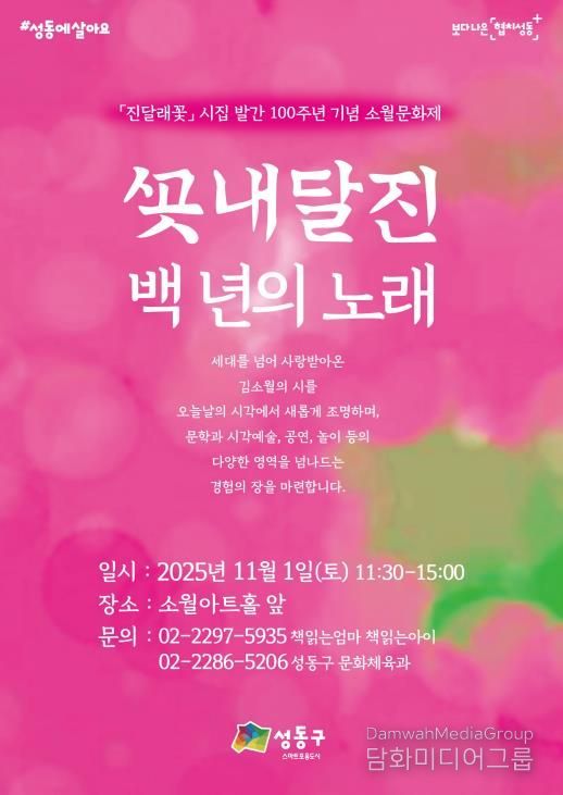 시민행정신문 이존영 기자 | 서울 성동구는 김소월 시집 ‘진달래꽃’ 출간 100주년을 기념해 오는 11월 1일 ‘진달래꽃, 백년의 노래’를 주제로 ‘2025 소월문화제’를 개최한다고 밝혔다.