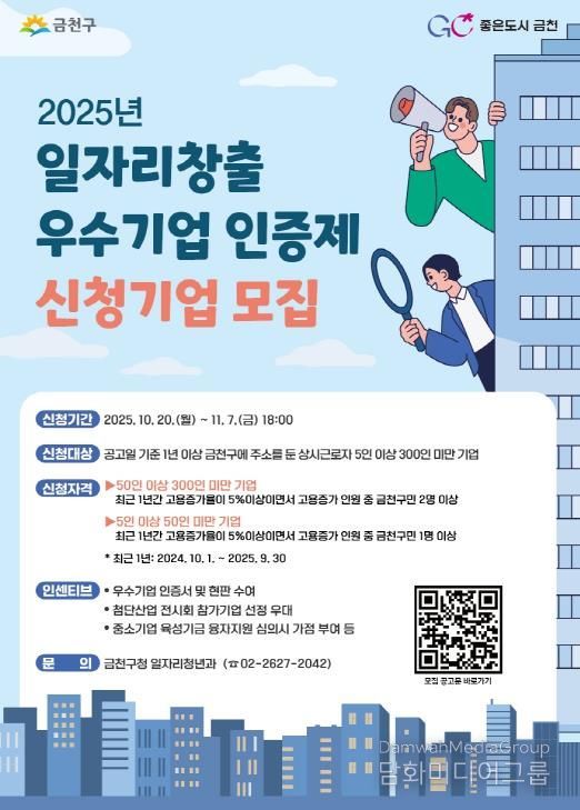 시민행정신문 강갑수 기자 | 금천구는 지역주민 고용창출에 기여한 관내 우수 중소기업을 발굴·지원하기 위해 ‘2025년 일자리창출 우수기업 인증제’ 참여기업을 모집한다고 밝혔다.