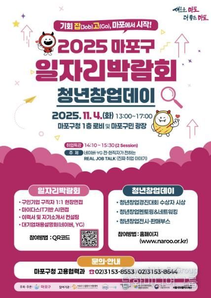시민행정신문 강갑수 기자 | 마포구는 구직자와 구인기업 간 만남의 장을 마련하고, 청년들의 창업문화를 확산하기 위해 오는 11월 4일(화) 오후 1시부터 5시까지 마포구청에서 ‘2025 마포구 일자리박람회·청년창업데이’를 개최한다.