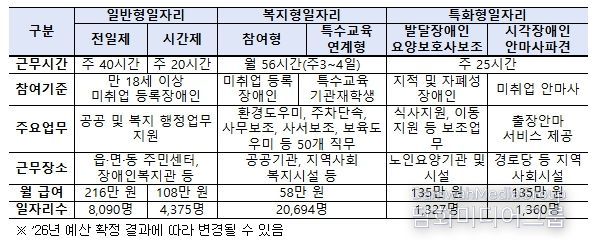 장애인일자리는 지방자치단체별로 11월부터 12월 중에 참여자를 모집할 계획이며, 소득수준, 장애 정도, 참여경력 등 선발기준 및 면접을 통해 선발된 참여자는 2026년 1월 1일부터 12월 31일까지 참여하게 된다.