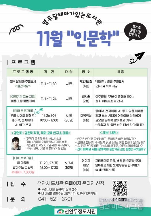 시민행정신문 강갑수 기자 | 천안시 두정도서관은 11월 한 달간 ‘인문학’을 테마로 도서관을 운영한다고 3일 밝혔다.