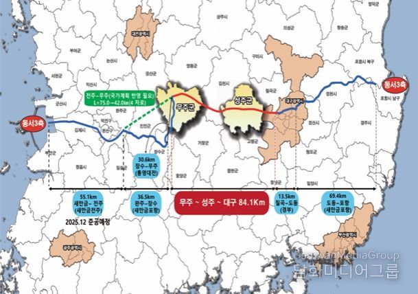 ‘무주~성주~대구 고속도로 건설사업’ 구간은 전북 무주군에서 경북 성주군을 거쳐 대구광역시로 이어지는 왕복 4차로로 총연장 84.1km이다. 고속도로와 일반도로(국도, 지방도)가 만나는 나들목 7곳, 고속도로와 고속도로를 연결하는 분기점 3곳을 포함하며 총사업비는 약 6조 4천억 원 규모다.