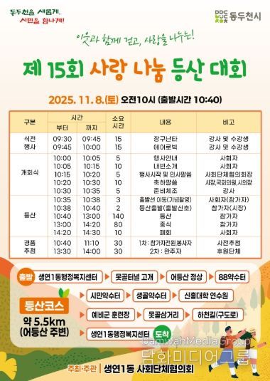 시민행정신문 강갑수 기자 | 동두천시 생연1동 사회단체협의회는 오는 8일 시민이 함께하는 ‘제15회 사랑나눔 등산대회’를 개최한다고 밝혔다.