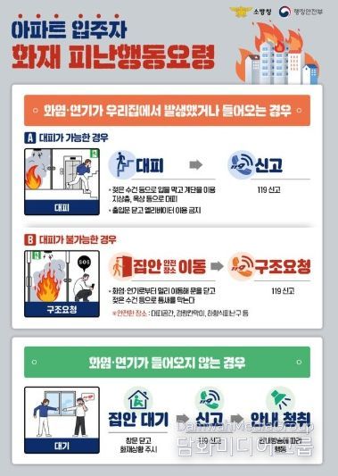 이처럼 침착하게 대피공간으로 피신해 구조를 기다린 사례는 매우 적절한 대응으로, 실제 화재 상황에서는 무작정 탈출하기보다 상황에 맞는 판단이 무엇보다 중요하다. 이에 따라 예전에는 공동주택 화재 시 대피 요령으로 “불나면 대피 먼저”를 강조했지만, 최근에는 “불나면 살펴서 대피”로 지침이 바뀌었다. 복도나 계단에 불길이나 연기가 가득할 경우에는 문을 닫고 대피공간, 경량칸막이, 하향식 피난구 등 피난 시설을 활용해 실내에서 구조를 기다리는 것이 더 안전할 수 있다.
