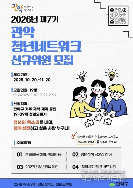 시민행정신문 강갑수 기자 | 청년친화도시 관악구가 청년들이 직접 청년을 위한 정책을 발굴하고 제안하는 '제7기 관악청년네트워크' 위원 19명을 신규 모집한다.
