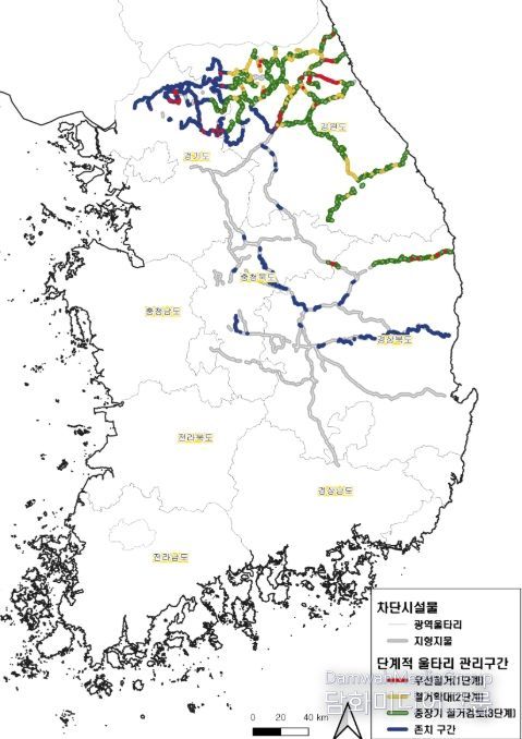 마지막으로 존치구간(621.2km)은 양돈농가 밀집지역(10km 이내)과 충남·전남·경남 등 아프리카돼지열병 비발생지역으로의 서진(西進), 남하(南下) 차단을 위해 최후 방어선 유지가 필요한 지역이 해당된다.