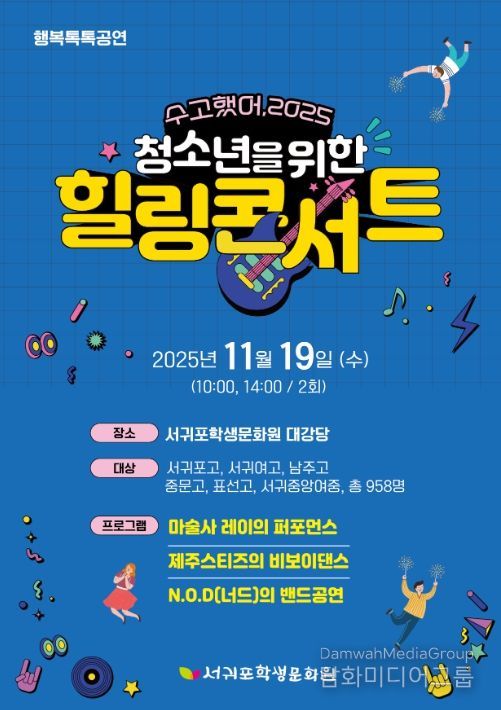 시민행정신문 기자 | 제주도교육청 서귀포학생문화원은 19일 서귀포학생문화원 대강당에서 행복톡톡 공연 ‘수고했어 2025, 청소년을 위한 힐링콘서트’를 오전 10시와 오후 2시 두 차례에 걸쳐 개최한다.