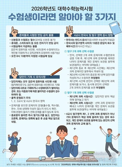 시민행정신문 기자 | 세종특별자치시교육청은 11월 13일에 실시되는 2026학년도 대학수학능력시험을 수험생들이 안정적으로 치를 수 있도록 ‘수험생 유의사항’을 안내했다.