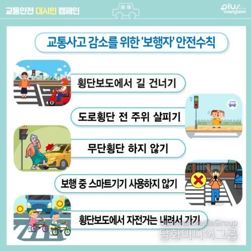 주요 홍보사항으로 보행자 안전수칙은 △횡단보도에서 길 건너기 △도로 횡단 전 주위 살피기 △무단횡단 하지 않기 △보행 중 스마트기기 사용하지 않기 △횡단보도에서 자전거는 내려서 가기 등이다.