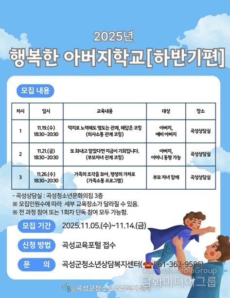 시민행정신문 강갑수 기자 | 곡성군청소년상담복지센터가 지역 사회 아버지들(지역 청년회 등)의 요구 분석을 통해 가족 내 소통 역량 증진을 위한 부모교육 프로그램 ‘행복한 아버지학교’ 제10기 참가자를 모집한다고 10일 밝혔다.