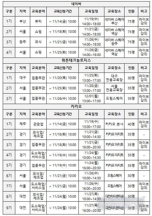 카카오는 제주, 경기, 서울, 대전에서 관광, 외식, 서비스, 제조 등 다양한 분야의 소상공인에 대한 인공지능(AI) 교육을 준비하고 있다. 챗GPT, 미드저니(Midjourney), 카나나(Kanana) 등을 활용하여 교육을 운영하며, ‘카카오테크 AI-스쿨 사장님 클래스’에서 활동 중인 인공지능(AI) 교육 전문가가 오프라인 강사로 참여한다.