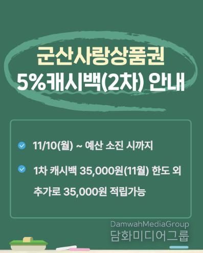 혜택은 11월 10일부터 예산이 소진될 때까지 시행되며, 모바일형 및 카드형 군산사랑상품권을 사용하는 시민이 대상이다.