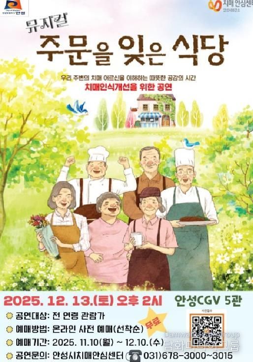 시민행정신문 기자 | 안성시보건소 치매안심센터는 오는 12월 13일 오후 2시, 안성 CGV에서 치매에 대한 올바른 이해와 공감 확산을 위한 치매인식개선 뮤지컬 '주문을 잊은 식당'공연을 무료로 개최한다.