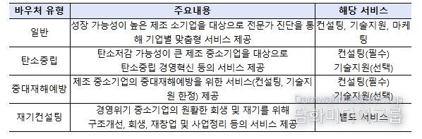 기업의 특성과 필요에 따라 4가지 유형(①일반, ②탄소중립, ③중대재해예방, ④재기컨설팅)으로 구분하며, 유형별로 기업 특성에 맞춘 3개 서비스(컨설팅·기술지원·마케팅)를 바우처 방식으로 지원할 예정이다.
