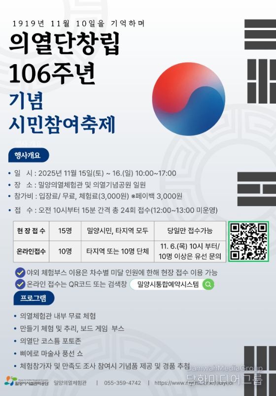 시민행정신문 강갑수 기자 | 밀양시시설관리공단(이사장 김경민)은 의열단 창립 106주년을 맞아 오는 15일부터 16일까지 이틀간 밀양의열체험관과 의열기념공원 일원에서 기념행사를 개최한다고 12일 밝혔다.