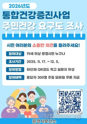 이번 조사는 2026년도 통합건강증진사업의 우선순위와 핵심 성과지표 선정 등 주민들의 건강 수요와 지역사회 특성을 반영한 보건정책 추진을 위해 마련됐으며, 설문 내용은 △통합건강증진사업 인식도 △서비스 만족도 △사업대상 우선순위 △건강증진사업 선호도 등 총 12개 문항으로 구성했다.
