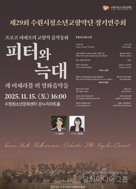 시민행정신문 강갑수 기자 | 수원시청소년청년재단 수원청소년문화센터에서는 오는 11월 15일 오후4시, 온누리아트홀에서 제29회 정기연주회를 개최한다. 이번 연주회는 ‘프로코 피에프의 교향적 음악동화 '피터와 늑대'’를 중심으로, 세대를 아우르는 감동의 영화음악을 함께 선보이며 청소년 단원들의 풍성한 음악적 성장을 보여줄 예정이다.
