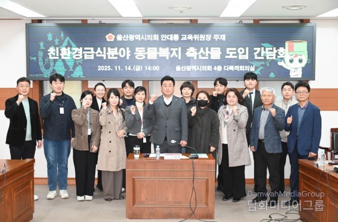 시민행정신문 기자 | 울산광역시의회 교육위원회 안대룡 위원장은 11월 14일 오후 2시, 시의회 4층 다목적회의실에서 ‘친환경급식분야 동물복지 축산물 도입 간담회’를 열고, 울산광역시교육청, 구·군 관계자, 지역 동물복지 인증농가 및 관련 기관들과 울산 학교급식의 지속가능성과 동물복지 강화를 위한 정책 방향을 논의했다.