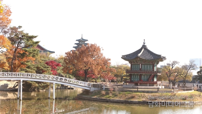 향원정으로 이어지는 하얀 목조다리 백세교는 경복궁의 대표적 포토 스폿을 넘어, 한국의 전통 건축이 지닌 ‘절제된 선의 미학’을 상징한다. 다리 아래로 천천히 흘러가는 낙엽과 물결은, 한국 문화가 수백 년의 시간을 어떻게 견뎌냈는지, 그리고 오늘날까지 이어지는 삶의 서정을 어떻게 담아내고 있는지를 조용히 전한다.