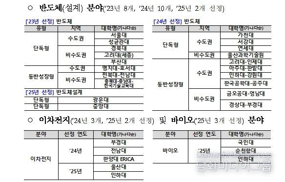 2025년에는 반도체 20개 사업단(30개교), 이차전지 5개교, 바이오 3개교를 대상으로 1,167억 원의 예산을 지원하여, 분야별로 대학의 역량과 강점에 기초한 특성화 인재양성 체계를 마련했다. 2026년에는 「국가첨단전략기술 지정 등에 관한 고시」 일부개정(’25.5.12.)에 따라 국가첨단전략기술에 새롭게 포함된 ‘로봇 분야’를 신설하여, 바이오 2개교 및 로봇 3개교를 선정하는 등 총 1,209억 원을 지원할 예정이다.