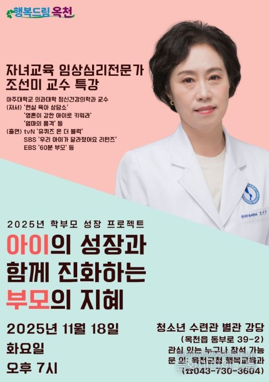 시민행정신문 강갑수 기자 | 옥천군은 학부모 성장 프로젝트의 일환으로 18일 19시 청소년수련관 별관 강당에서 아주대학교 의과대학 정신건강의학교실 조선미 교수를 초청해 부모 교육 명사 특강을 개최했다.